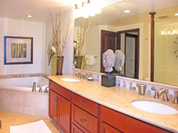 - Elegant dark wood interiors, travertine stone floors, Jenn-Air appliances, full size washer/dryer, full-sized Sub Zero refrigerator/freezer, designer style furniture in island motif